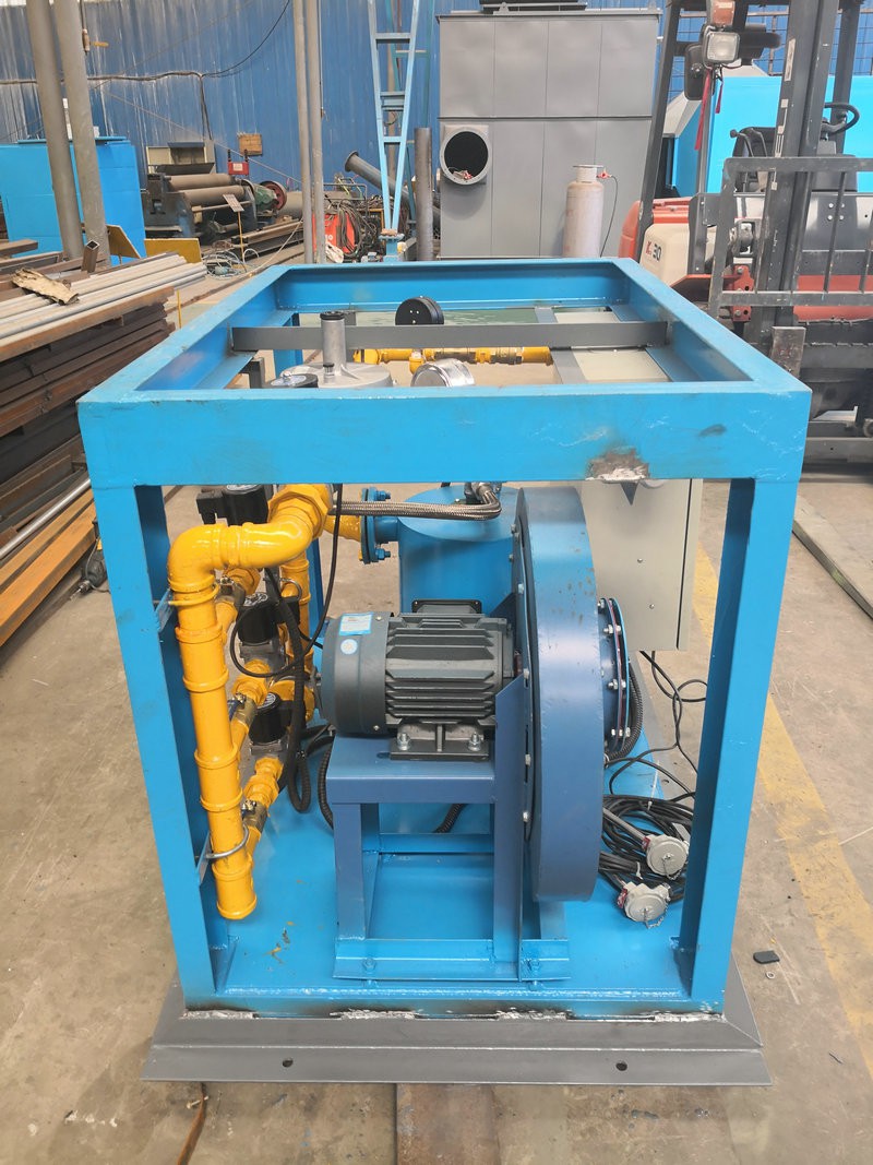 中間包烘烤器:包括燃燒器、鼓風機、助燃風管道系統(tǒng)和煤氣管道系統(tǒng),所述助燃風管道系統(tǒng)一端連接鼓風機,另一端接入位于燃燒器前的煤氣管道系統(tǒng),還包括通過控制煤氣管道閥門開閉自動調(diào)節(jié)溫度的控制系統(tǒng),所述燃燒器為1-5個(根據(jù)膜胎尺寸確定),中間包工作層受熱均勻,易脫模節(jié)能效果明顯。